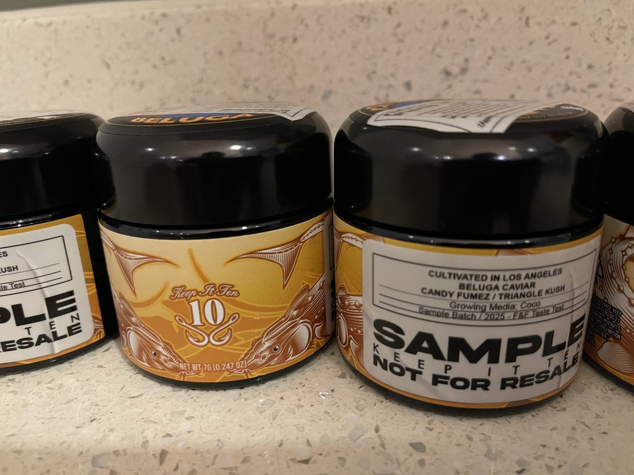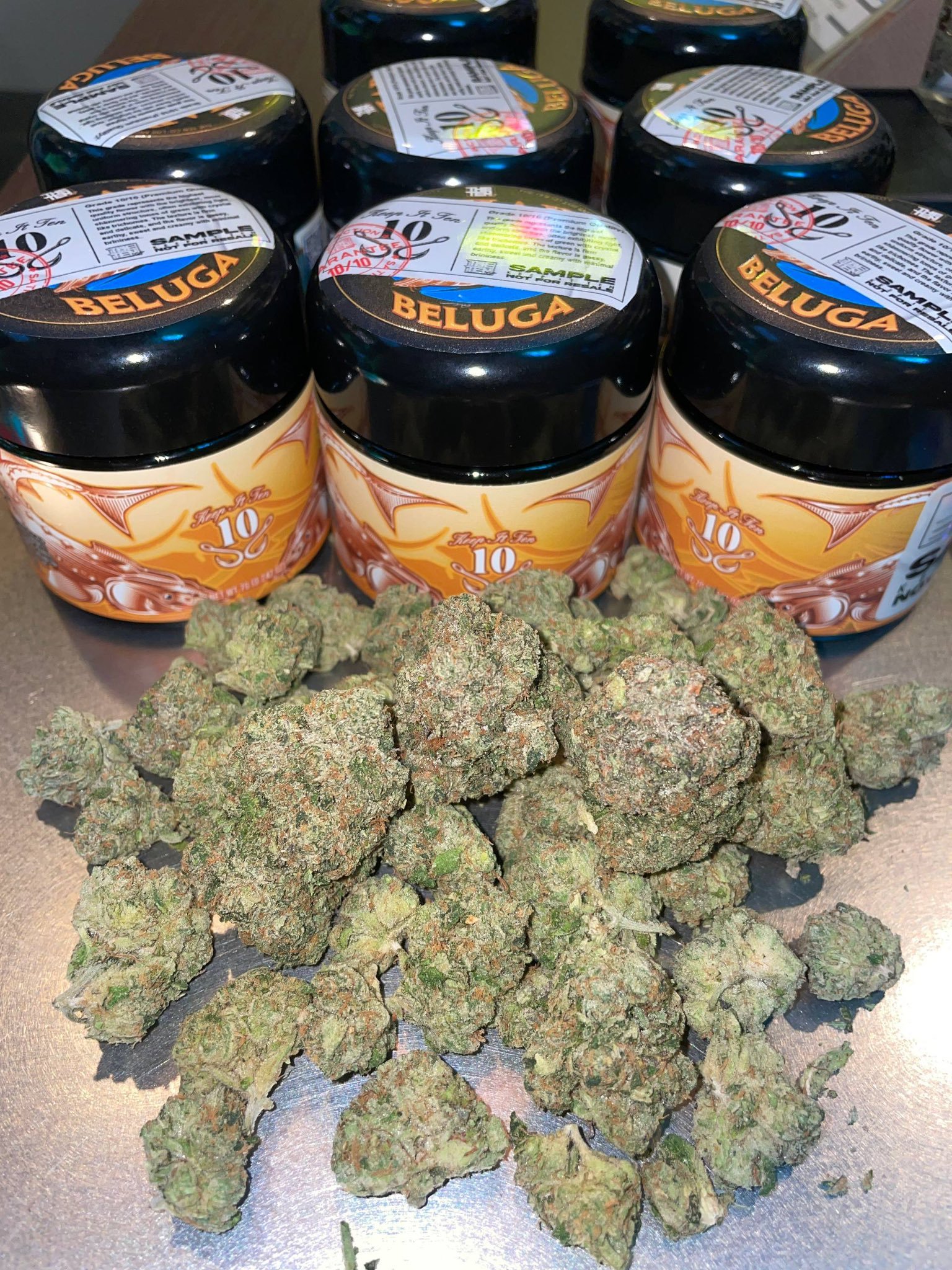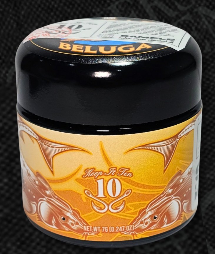 Elevate your cannabis experience with Beluga Caviar strain by THE TENCO, the ultimate luxury flower that lives up to its name. Packaged in an iconic gold-black caviar-style jar featuring stunning sturgeon-inspired fish artwork and the signature “Keep It Ten 10” branding, this 7g sample (NET WT 7G / 0.247 OZ) delivers elite quality you can see, smell, and taste. The dense, frosty nugs shown in the photos boast rich green hues with heavy resin coverage – exactly what discerning smokers expect from a top-tier Cali pack.