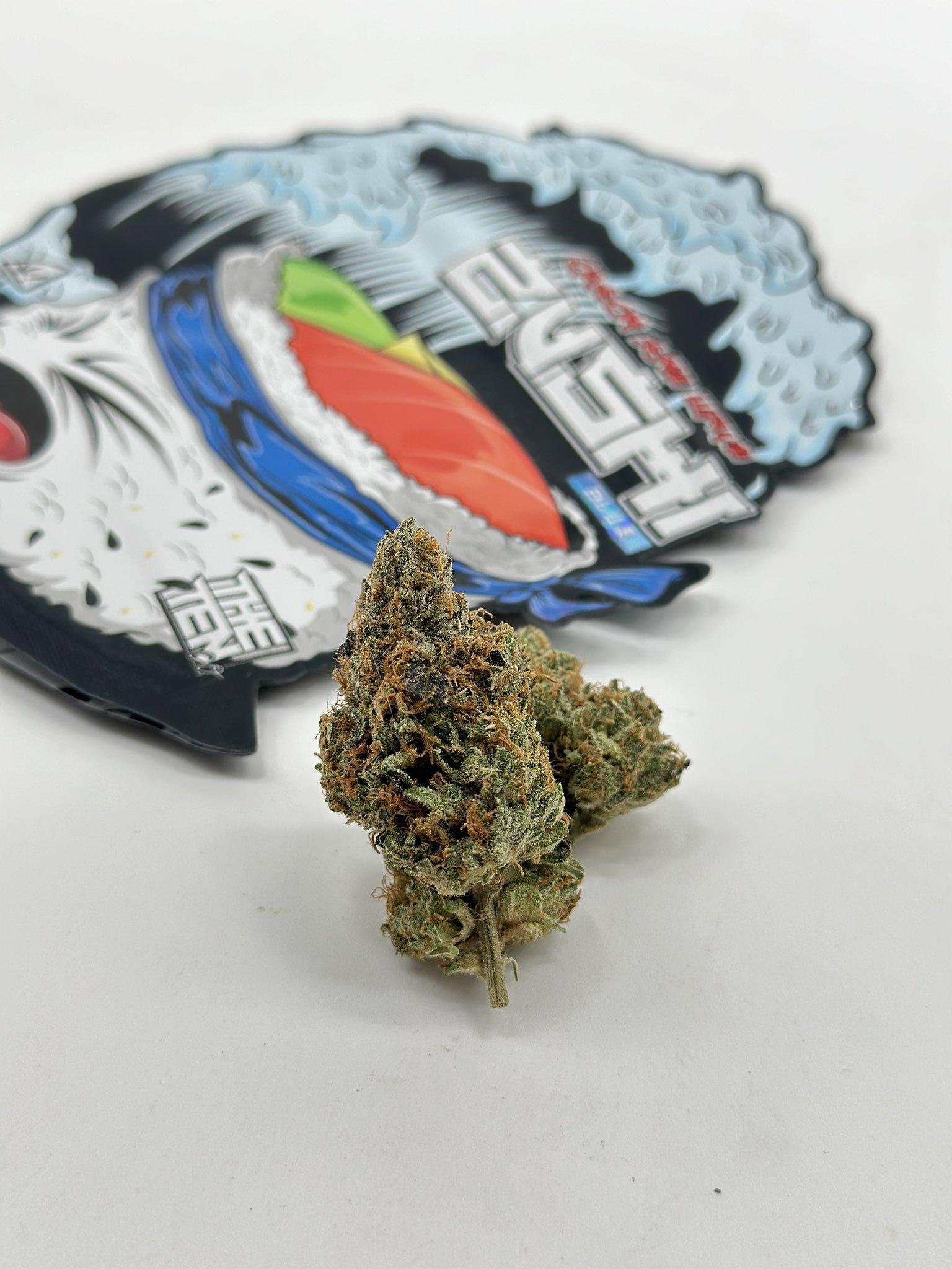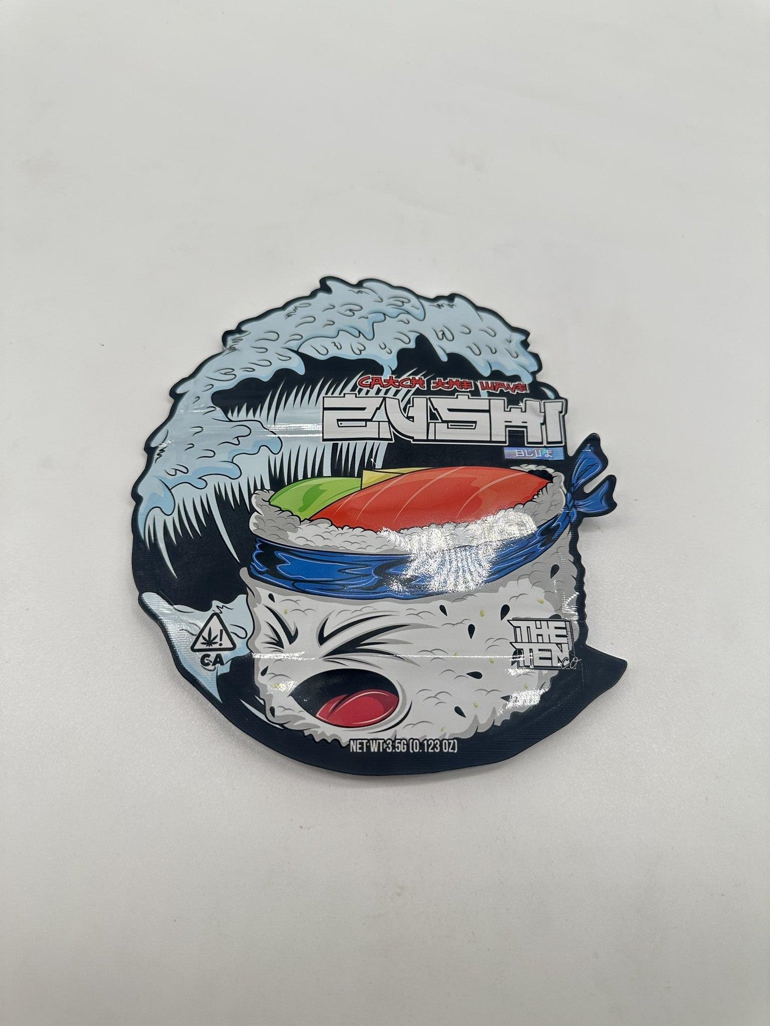 Lab-tested for purity and consistency, our 3.5g (0.12 oz) packs of Blue Zushi flower come sealed in child-resistant, eco-friendly packaging featuring that iconic sushi-inspired design—complete with crashing waves and a mischievous maki roll character—for discreet, stylish storage. Whether you’re combating afternoon fatigue or enhancing intimate evenings, this strain’s moderate burn rate and dense structure ensure every puff counts, providing up to 2-3 hours of serene, ocean-deep tranquility.